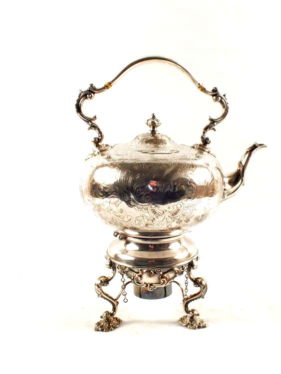 A Victorian Silver plated on Copper spirit kettle with leaf chasing on ornate feet
