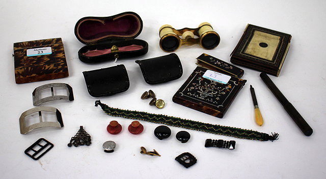A VICTORIAN TORTOISE SHELL MOUNTED CALLING CARD CASE together with a further tortoise shell calling card case with mother of pearl inlay (AF), an Indian vizagapatam calling card case (AF) and further items to include a pair of antique buckles, a pair