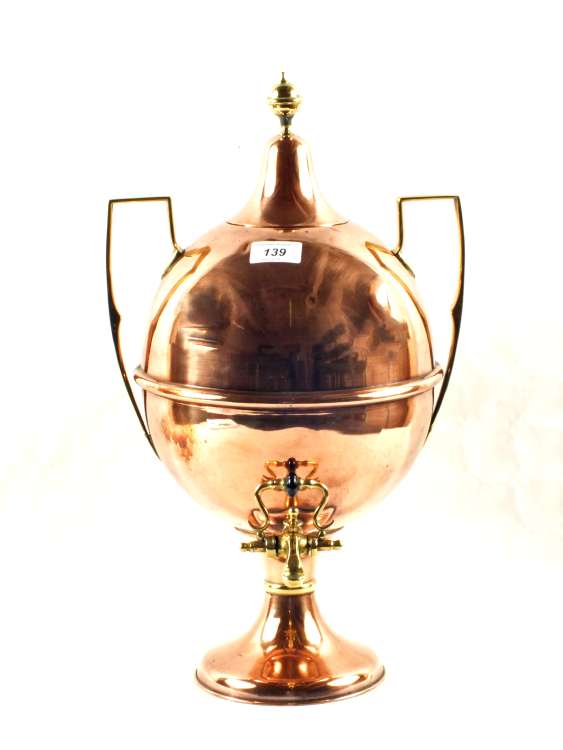 A Victorian twin handled Copper and Brass samovar of globular form on circular base