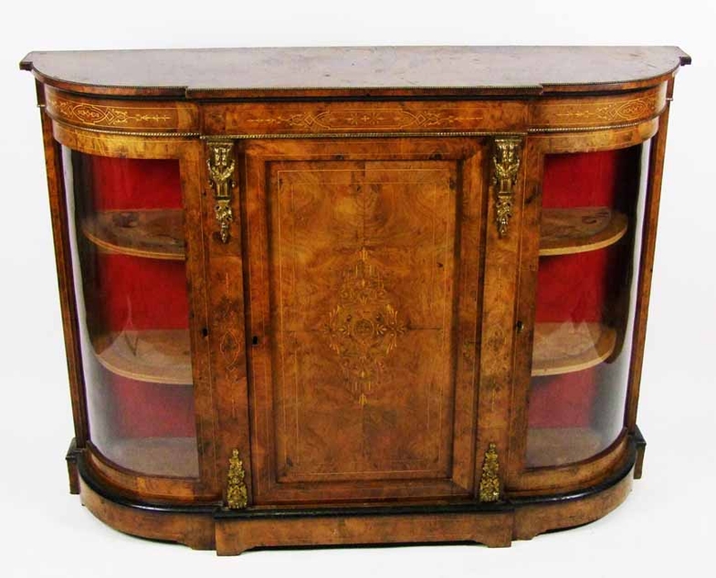 A Victorian walnut and inlaid credenza, the central panelled door flanked by bowed glass doors, on plinth base