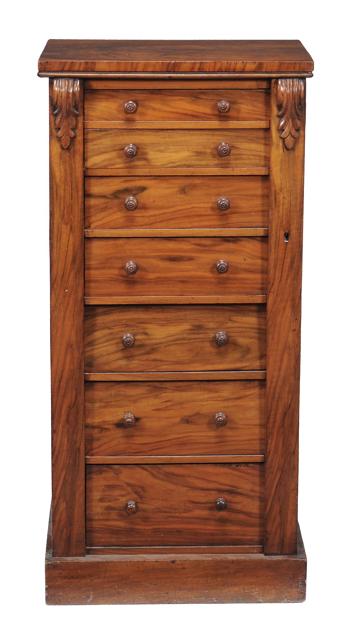 with seven drawers flanked by plain pilasters surmounted by moulded corbels, on a plinth base