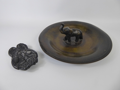 A Vintage Metal Elephant Tray, approx 33 cms dia., together with a cast iron ash tray in the form of pair of hands.