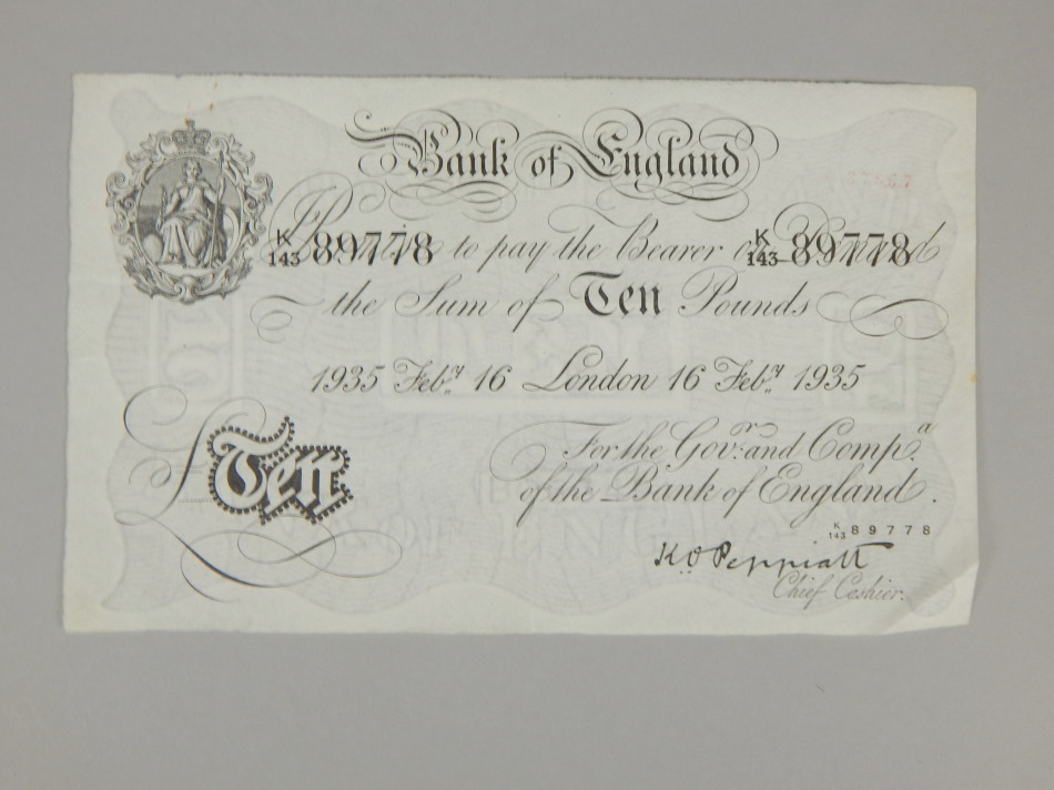 A white £10 note for 1935, chief cashier Peppiatt, 10th February, London