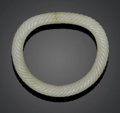 Of compressed ovoid form carved all around in a twisted rope pattern, the stone of pale greenish-white hue (crack through top of bangle). 3in (7.6cm) length across exterior 2 1/4in (5.8cm) width across interior