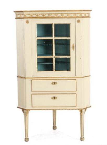 A white-painted and partially gilt Louis XVI style corner cabinet