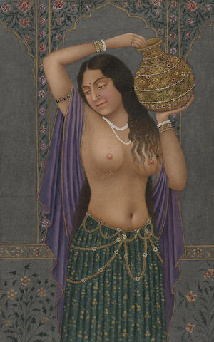 Opaque watercolor on paper; partially clad, a gold embellished water pot held in her hands; the reverse inscribed in pencil with the name of the artist