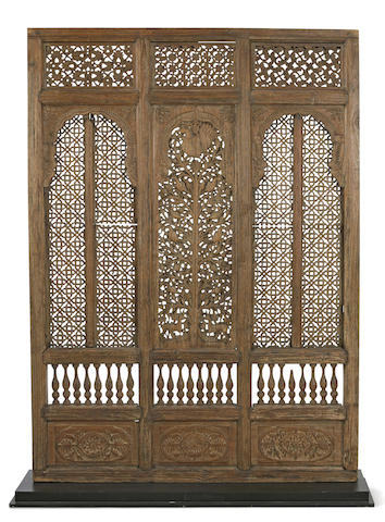 Finely carved with central geometric lobed jali screens flanking an intricate central tree with deer, parakeets, and a peacock