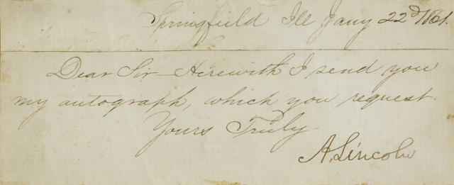 Manuscript Note Signed ("A. Lincoln"), 4 lines on a 2 x 5 1/4 inch slip, Springfield, January 22, 1861, lightly smudged. Float-mounted and framed WITH: Albumen print portrait photograph by Warren, captioned "The Last Photograph of President Lincoln,"