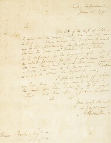 Autograph Letter Signed ("A Hamilton"), 1 p, 4to, Treasury Department, January 21, 1795, to THOMAS PINCKNEY, toned. Matted. Provenance: Hamilton, Sep 4, 1975, lot 196.