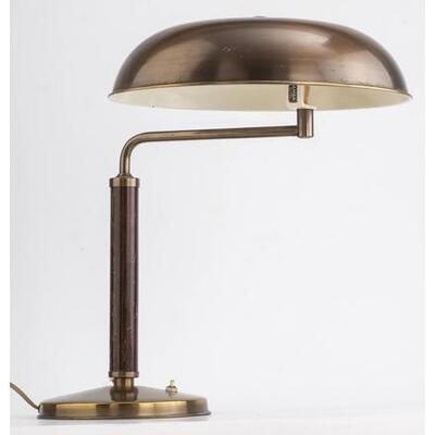 Alfred Müller, removable lamp "Quick 1500" brass finish with foot partly in wood, edition Amba (Basel), drawn in 1935.