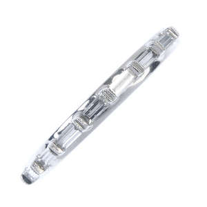 An 18ct gold diamond dress ring. Comprising a baguette-cut diamond line, with bar spacers, to the plain half-band. Estimated total diamond weight 0.15ct. Hallmarks for London. Ring size N 1/2. Weight 2.9gms.