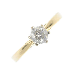 The brilliant-cut diamond, to the plain band. Diamond weight 0.50ct, stamped to band, estimated H-I colour, P1 clarity. Hallmarks for Birmingham. Ring size L. Weight 4.2gms.