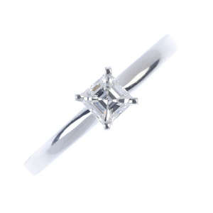 An 18ct gold diamond single-stone ring. The square-shape diamond, to the plain band. Estimated diamond weight 0.35ct, H-I colour, VS clarity. Hallmarks for Birmingham. Ring size M 1/2. Weight 2.5gms.
