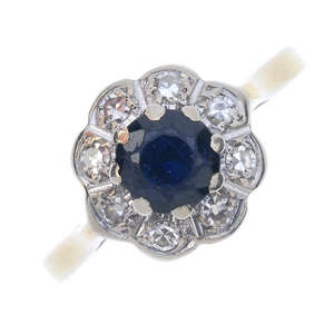 The circular-shape sapphire, within a single-cut diamond scalloped surround, to the plain band. Estimated total diamond weight 0.15ct. Hallmarks for London, 1963. Ring size I 1/2. Weight 3.5gms.