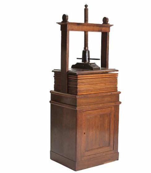 An 18th-19th century oak linen press, top with wood spindle, front with door