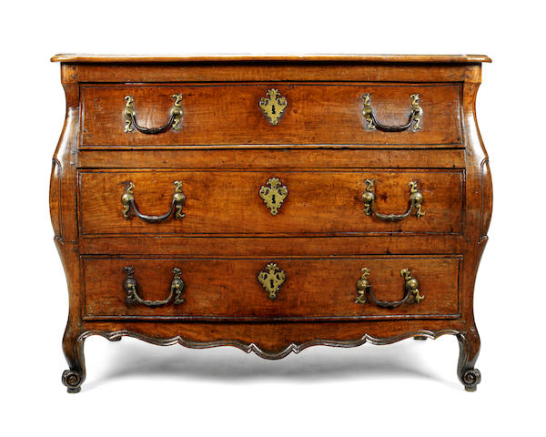 An 18th century French Provincial Louis XV bombe serpentine commode