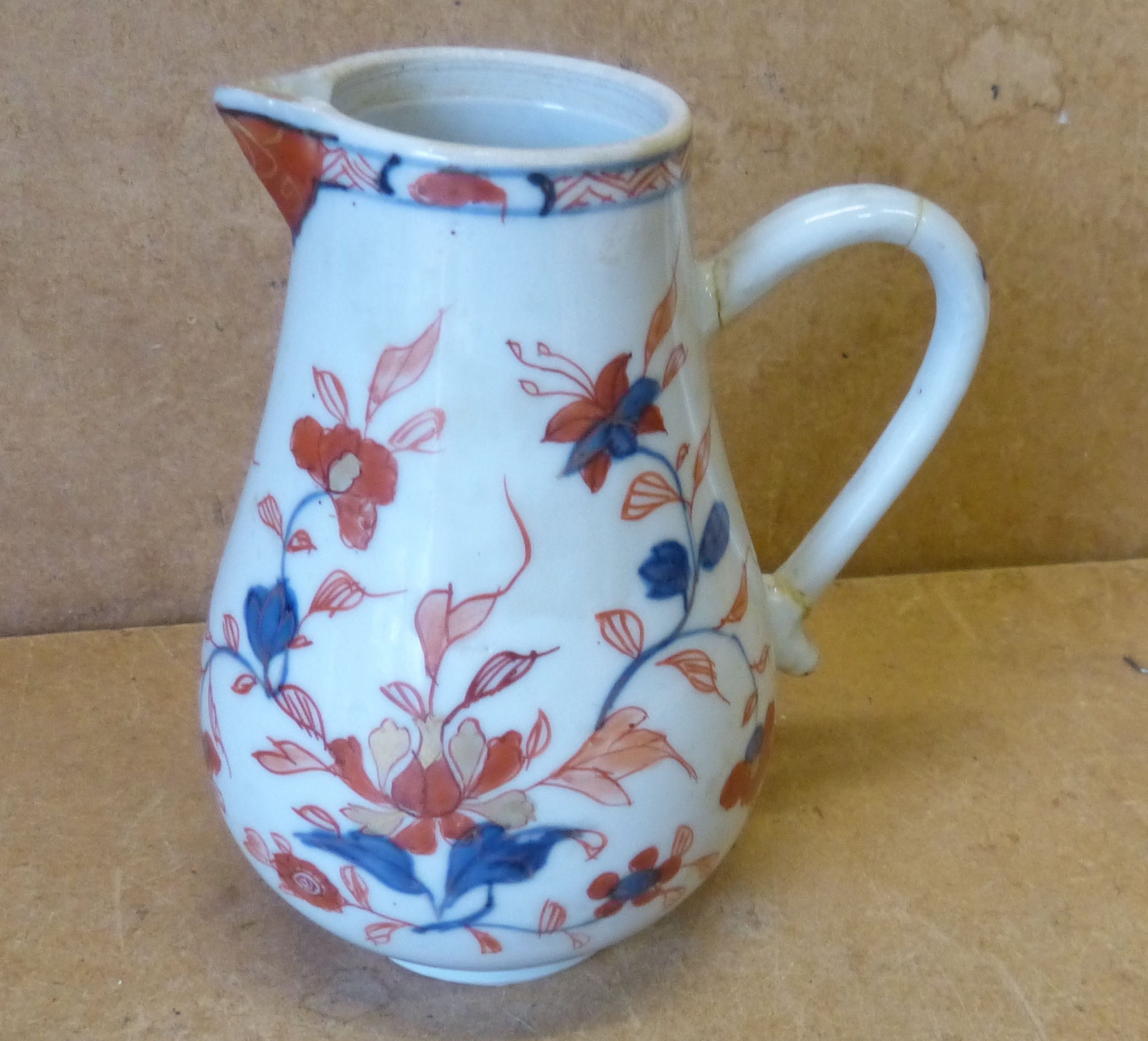An 18th Century New Hall Style Round Bulbous Sparrow Beak Jug on white ground having Imari pattern decoration