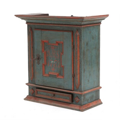 An 18th century partly green and red painted cupboard, front with one drawer and door, embellished with initials J.R.S. anno 1781. H. 75. W. 73. D. 35 cm.