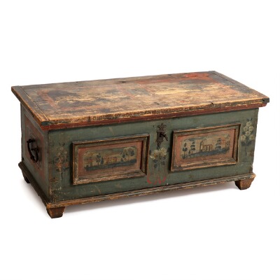 An 18th century pine chest, decorated with prospects and foliage