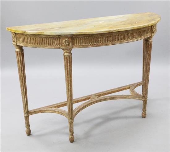 An Adam style giltwood demi lune console table, with simulated marble top, W.4ft 2in
