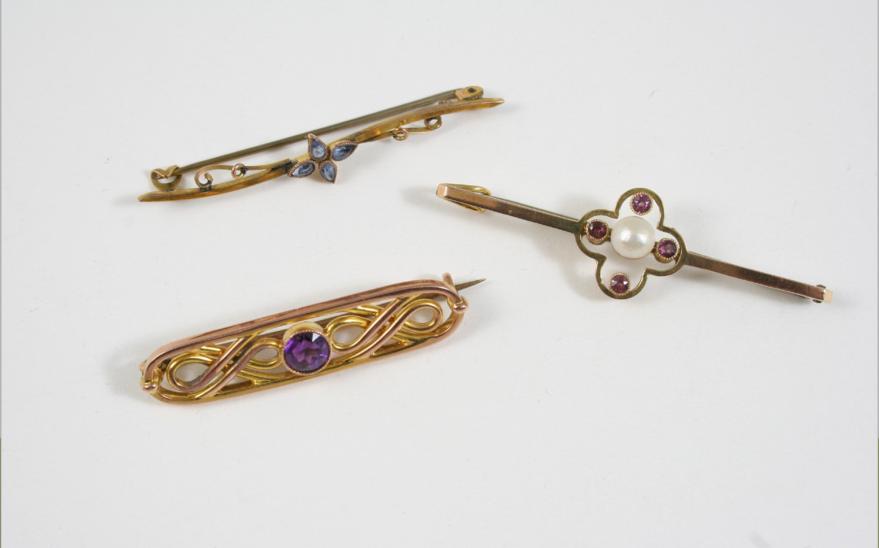 AN AMETHYST AND GOLD BROOCH the openwork design is centred with a circular-cut amethyst, 4cm. long, together with a garnet, cultured pearl and gold brooch, 5cm. long, and another gold brooch