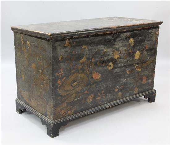An antique pine trunk, painted and lacquered with chinoiserie style decoration, W.4ft