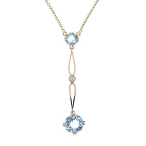 An aquamarine and split pearl pendant. The circular-shape aquamarine drop, suspended from a split pearl and bifurcated bar, to the circular-shape aquamarine surmount and integral trace-link chain. Length of pendant 4cms. Length of chain 40cms. Weight