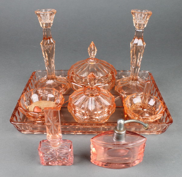 pair of candlesticks, 2 circular jars and covers, circular jar and a ring tree together with a pink tinted glass boat shaped perfume atomiser 2" (chips to base) and pink glass scent bottle 4"