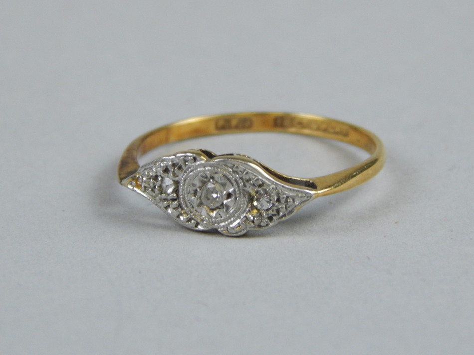 with three tiny diamonds, yellow metal, marked 18ct and PLAT (AF), 1.7g all in