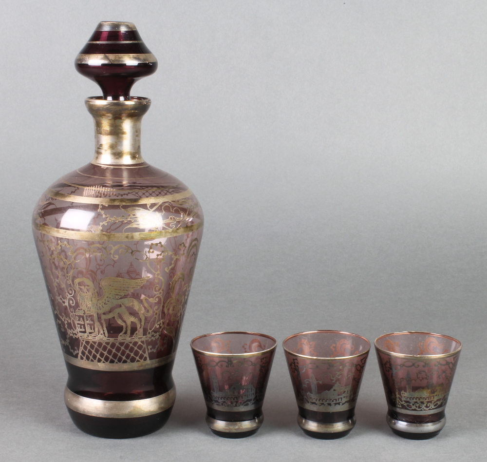 An Art Deco silvered liqueur set decorated with Venetian scenes comprising a decanter and 3 tots
