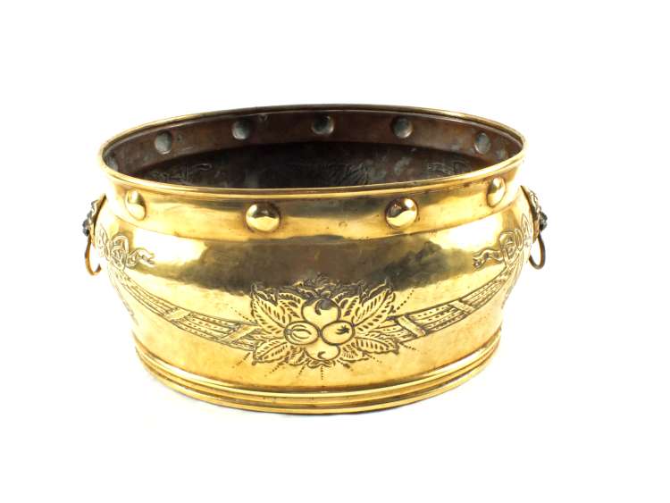 An Arts and Crafts oval embossed Brass jardinière/wine cooler with lion mask ring handles