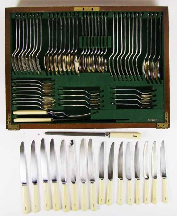 comprising eight table forks, eight dessert forks, eight dessert spoons, eight soup spoons, four table spoons, eight egg spoons and eight teaspoons, maker's mark of WRH & Co, Sheffield 1956, approx. weight 83 troy oz; together with bone handled knive