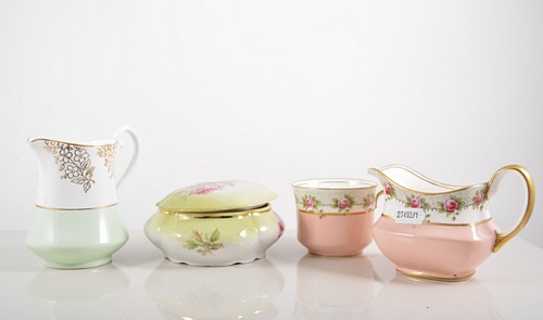 An Aynsley Rosebud design tea service, and a Phoenix bone china tea set in pale green with gilt highlights and a floral dressing table set.
