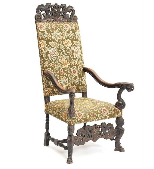 An early 18th century Danish Baroque oak armchair, richly carved with foliage and King Frederik IV's monogram