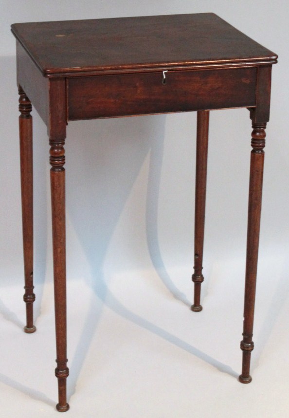the rounded moulded over hanging top raised above a frieze drawer on upper ringlet cylindrical supports