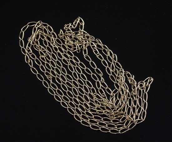 An early 20th century 15ct gold shaped oval link guard chain, 61.5in.