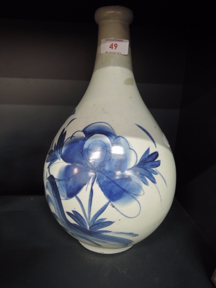 An early 20th century Chinese stoneware bottle vase having blue floral decoration