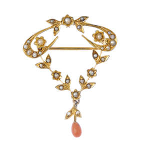 The ovoid coral drop, suspended from a split pearl floral chevron and scrolling surmount. May be worn as a brooch. Length 4.4cms. Weight 4.1gms.