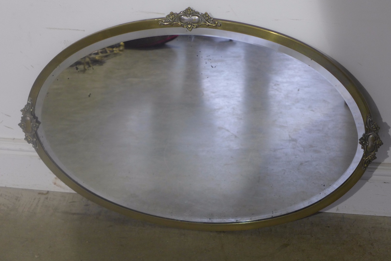 An early 20th century oval brass framed wall mirror with bevelled glass and carved decoration
