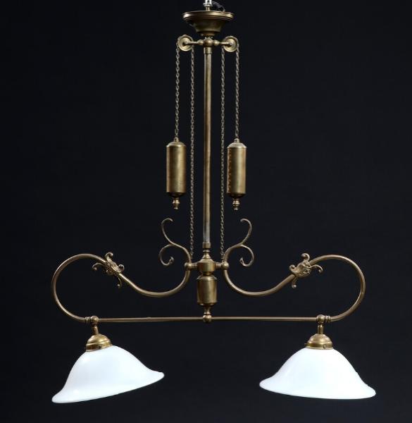 An early 20th century patinated brass two-light Billard lamp with opal glass shades
