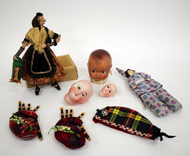 AN EARLY TO MID 20TH CENTURY FELT DOLL, 20cm in length together with two antique continental porcelain dolls heads and further items