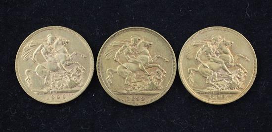 An Edward VII gold sovereign, 1906 and two Victoria gold sovereigns, 1892 and 1899 (Melbourne Mint) (3)