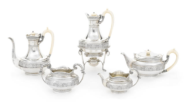 In the Regency style of Paul Storr, comprising: a hot water jug on stand, a coffee pot, a tea pot, a cream jug and a sugar bowl, total gross weight approximately 136ox troy