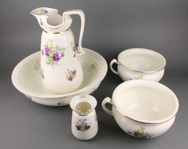 An Edwardian 6 piece wash stand set comprising water jug, bowl, 2 chamber pots and a toothbrush pot decorated with flowers
