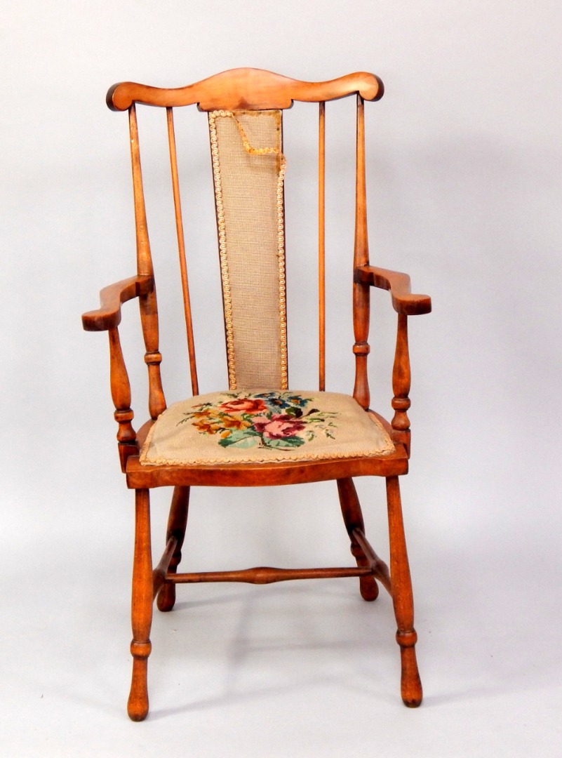An Edwardian oak country chair, with wool work back and floral tapestry seat, raised on turned legs