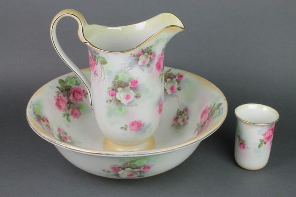 An Edwardian water jug, bowl and toothbrush pot decorated with roses