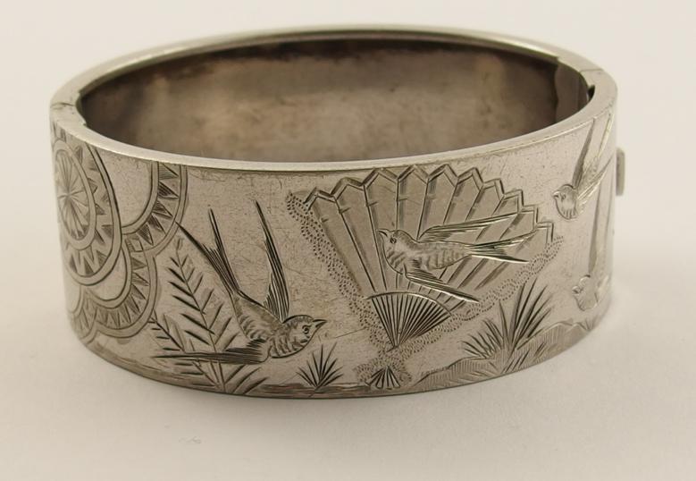 An Edwardian white metal hand engraved bangle depicting birds and Chinese symbols