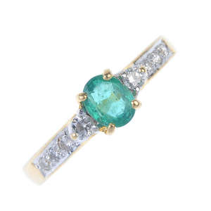 An emerald and diamond dress ring. The oval-shape emerald, with brilliant-cut diamond sides, to the similarly-cut diamond line shoulders. Estimated total diamond weight 0.15ct. Ring size L. Weight 2gms.