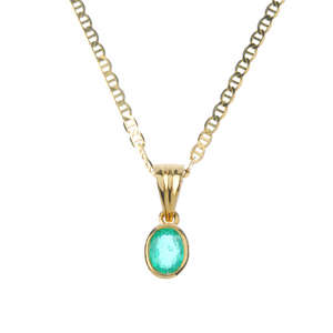 The pendant designed as an oval-shape emerald collet suspended from a tapered surmount and fancy-link chain, together with a single colourless gem ear stud. Length of pendant 1.7cms. Length of chain 49cms. Weight 5.4gms.