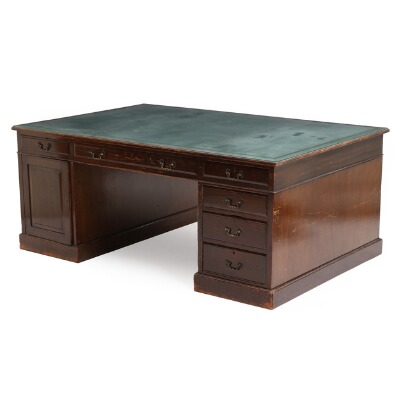 An English 20th century mahogany Partner's desk, top with gilded leather, apron with six drawers